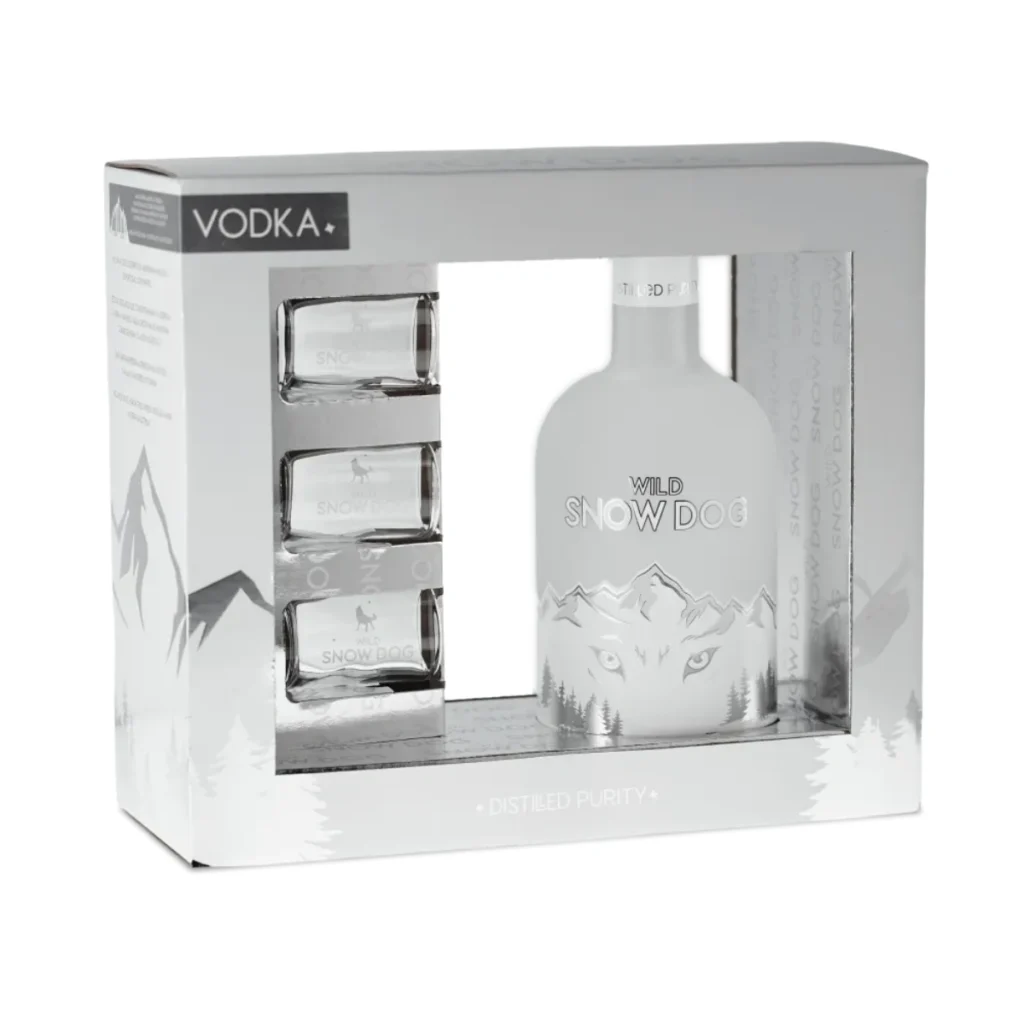 Estuche Wild Snow Dog Vodka con 3 Vasos de Chupito (Shot)