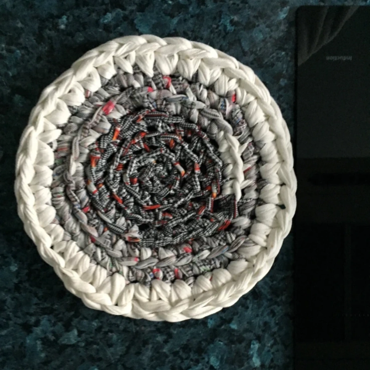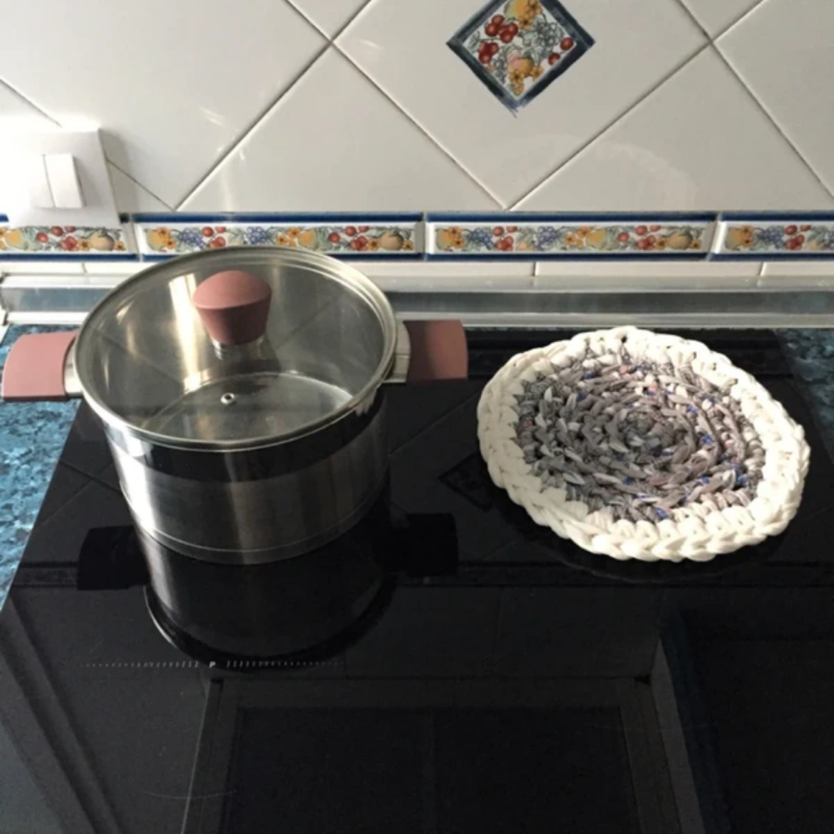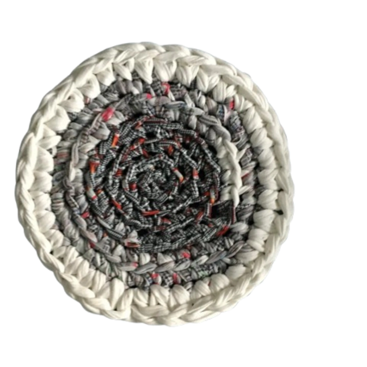 Base Mittus hecha a mano en trapillo de algodón, combinando tonos gris y blanco.
