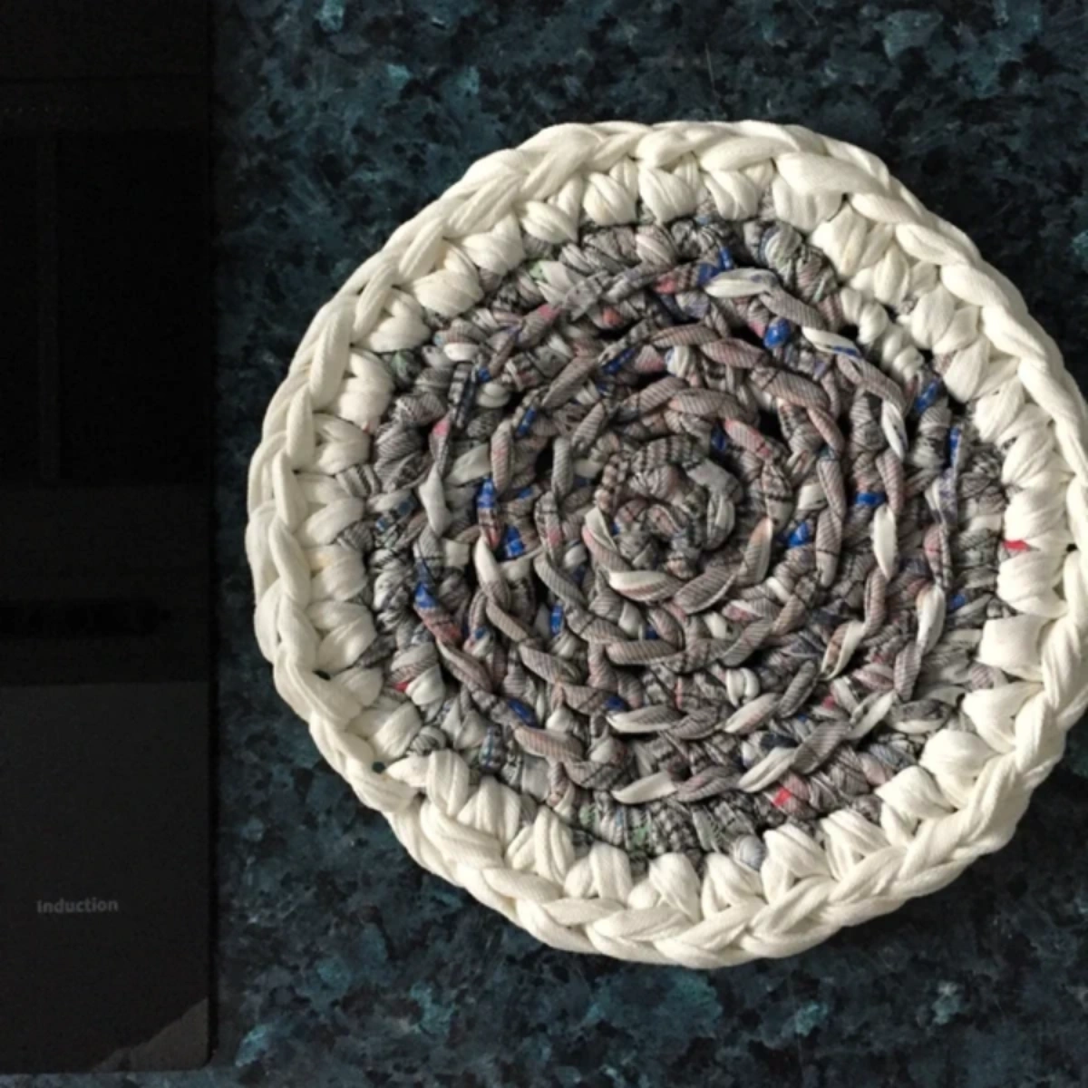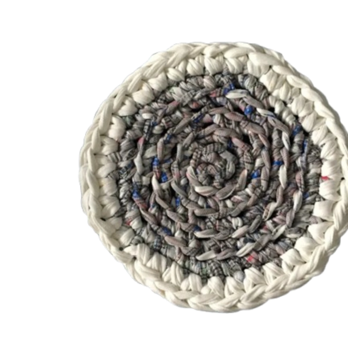 Base Mittus artesanal confeccionada a mano en trapillo de algodón con tonos variados y blanco.