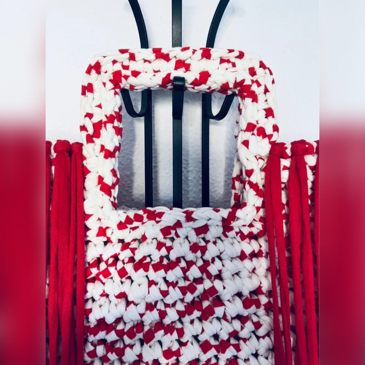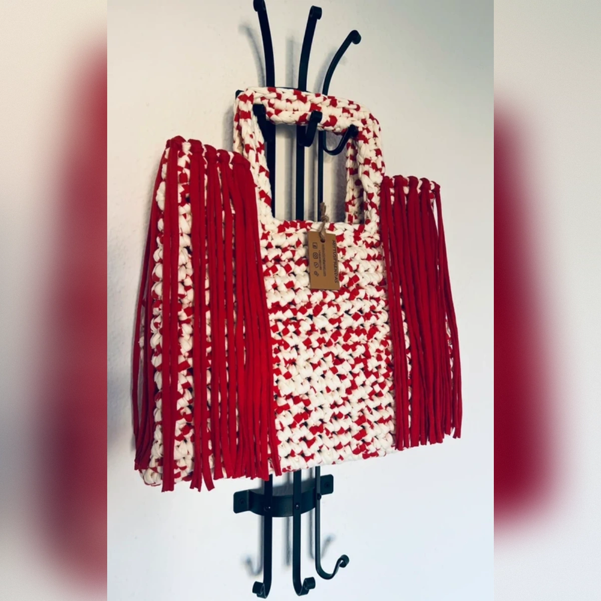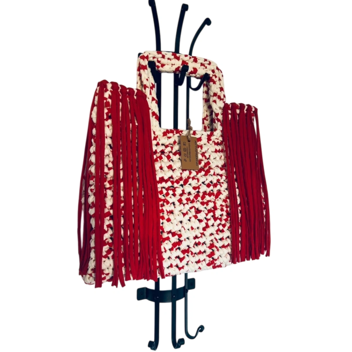 Bolsa de mano Mittus confeccionada a mano en trapillo de algodón con diseño bicolor rojo y blanco.