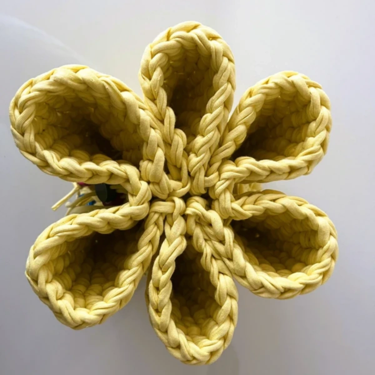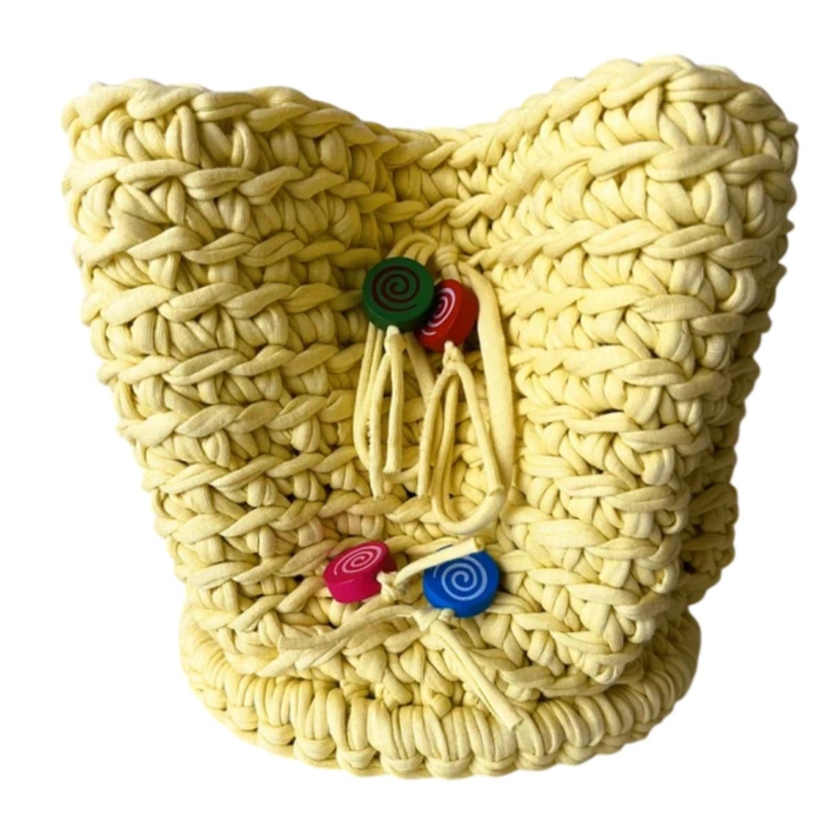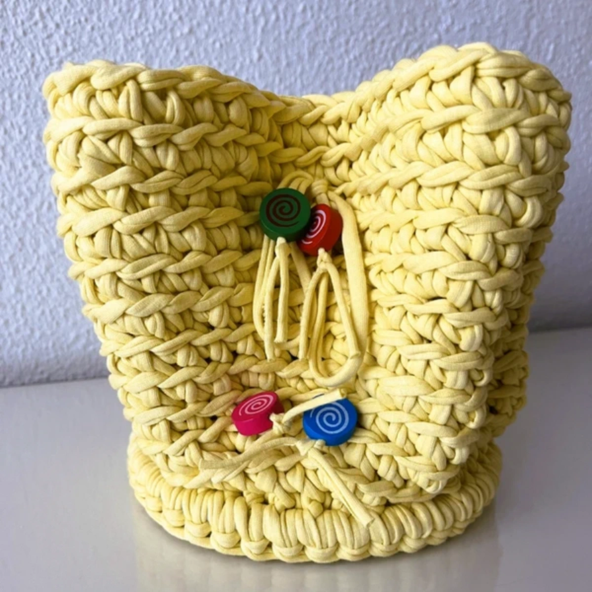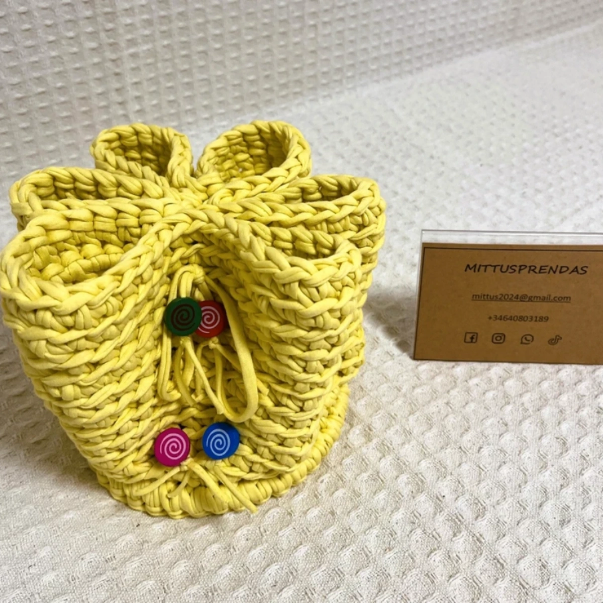 Bolsa multiusos hecha a mano, confeccionada en trapillo de algodón amarillo. Ideal para guardar accesorios, cosméticos o como decoración funcional en el hogar. Lavable en lavadora y con acabado artesanal de alta calidad.