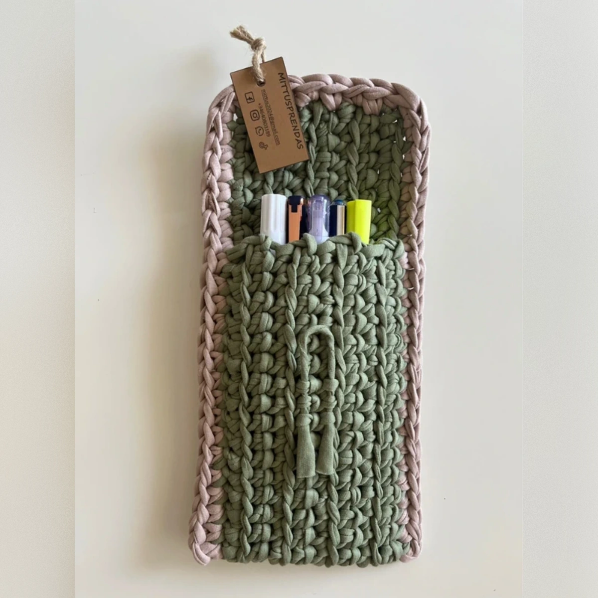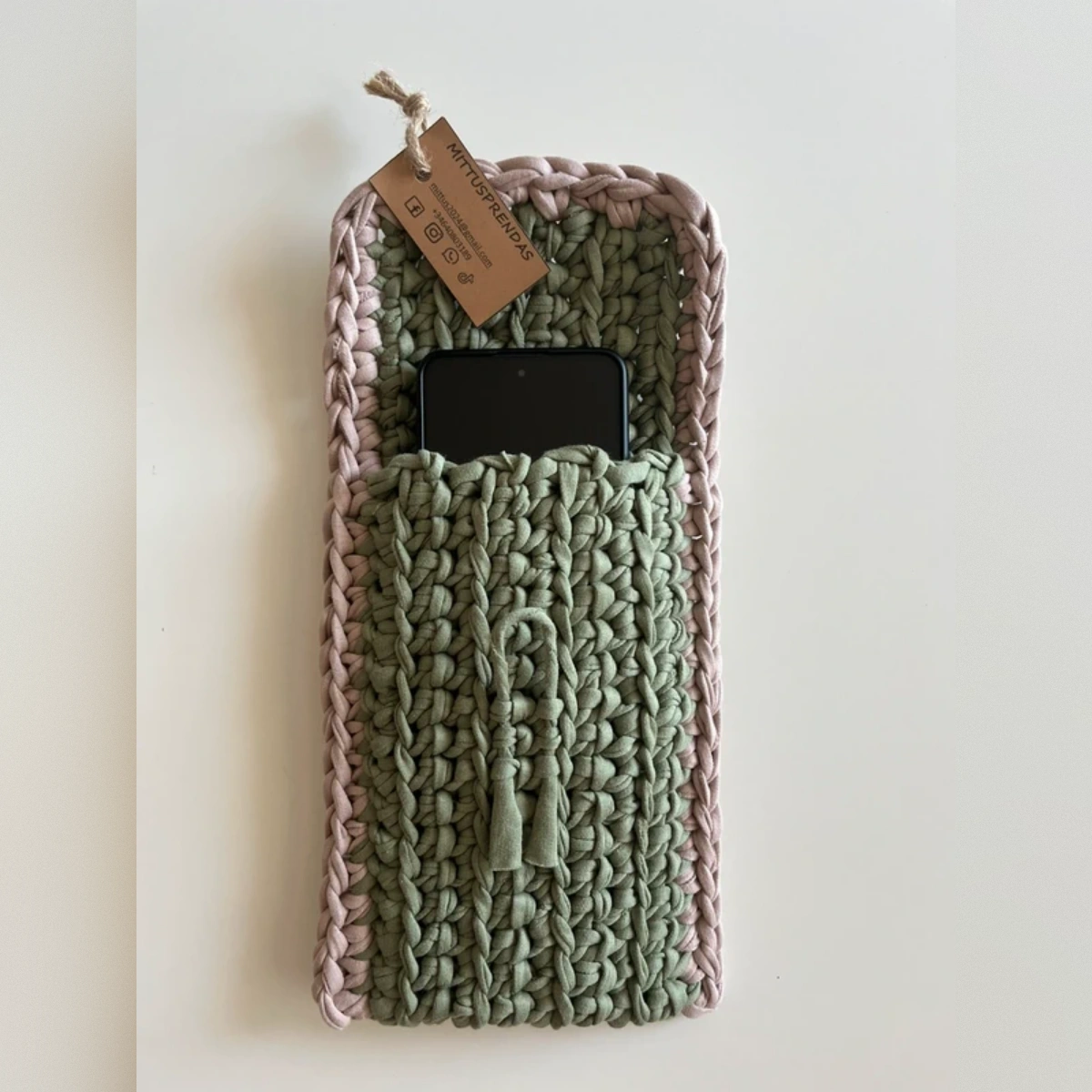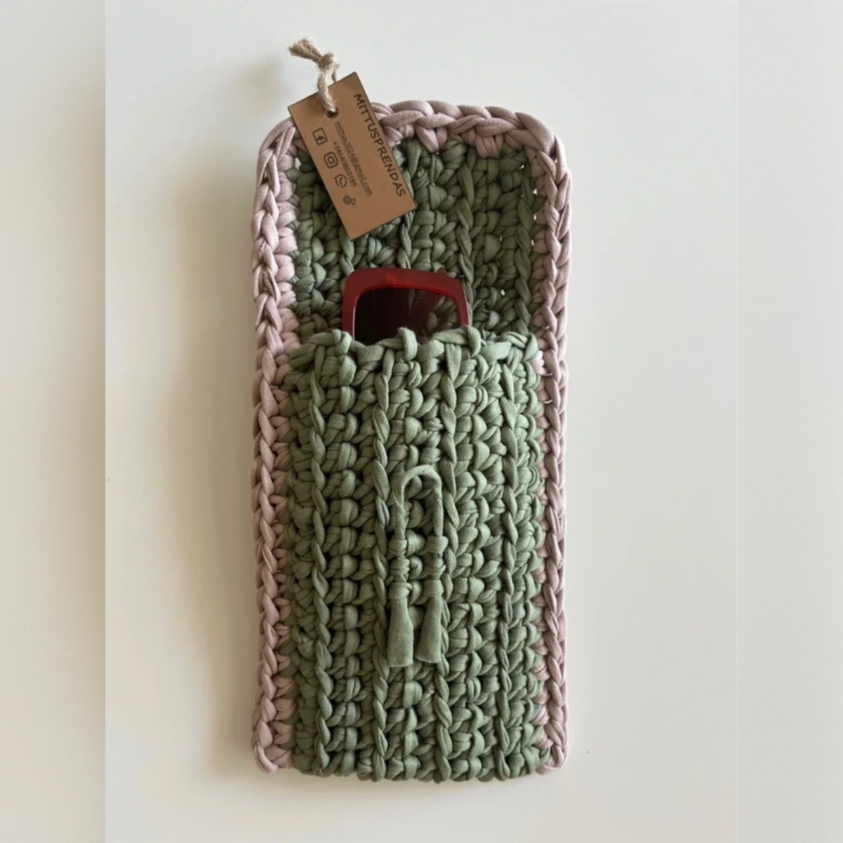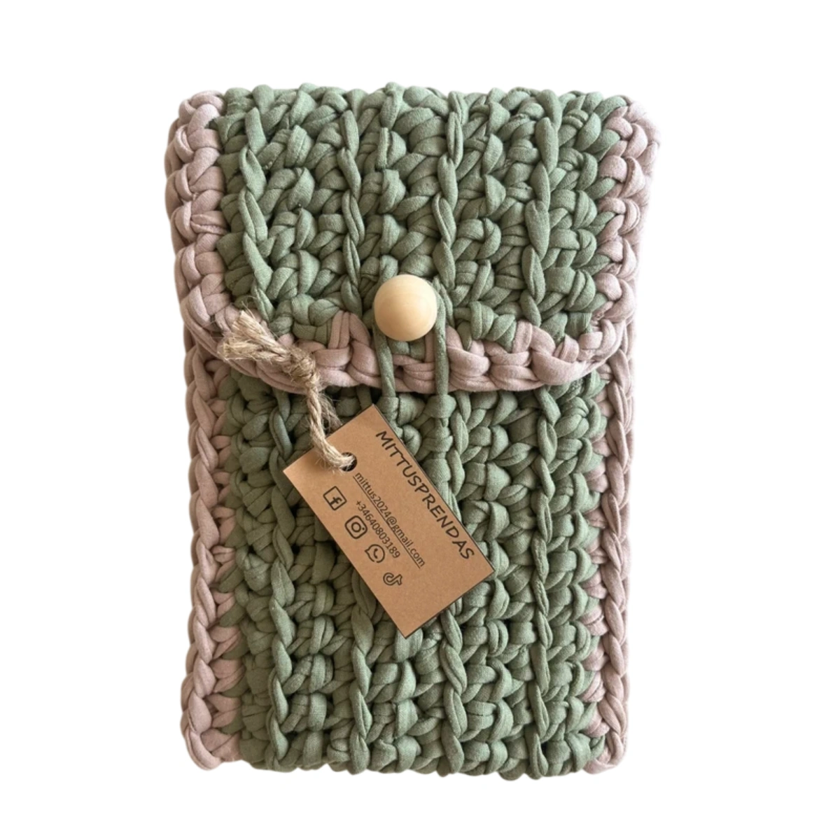 Bolso Mittus hecho a mano en trapillo de algodón, con una armoniosa combinación de tonos verde y beige.