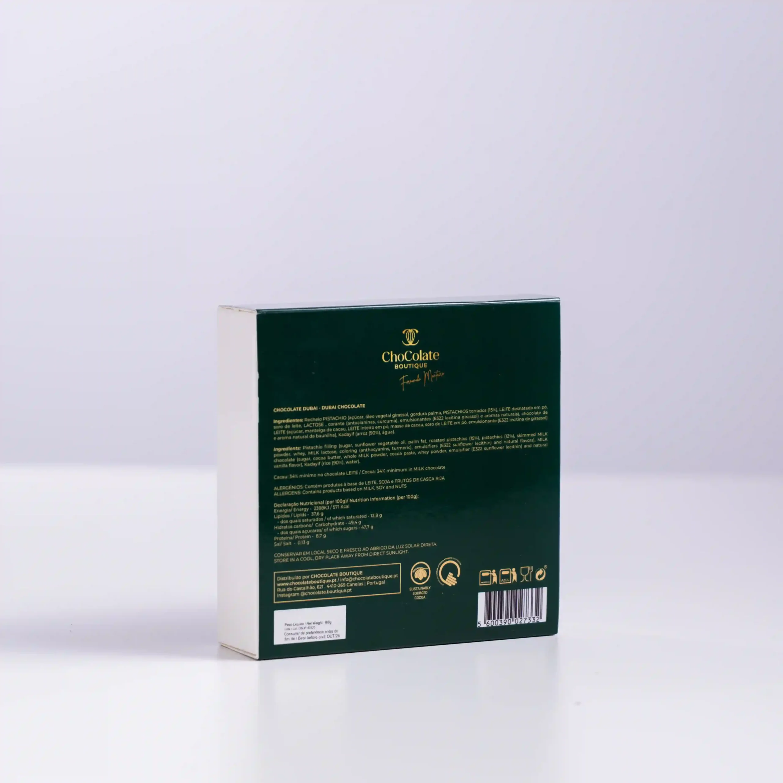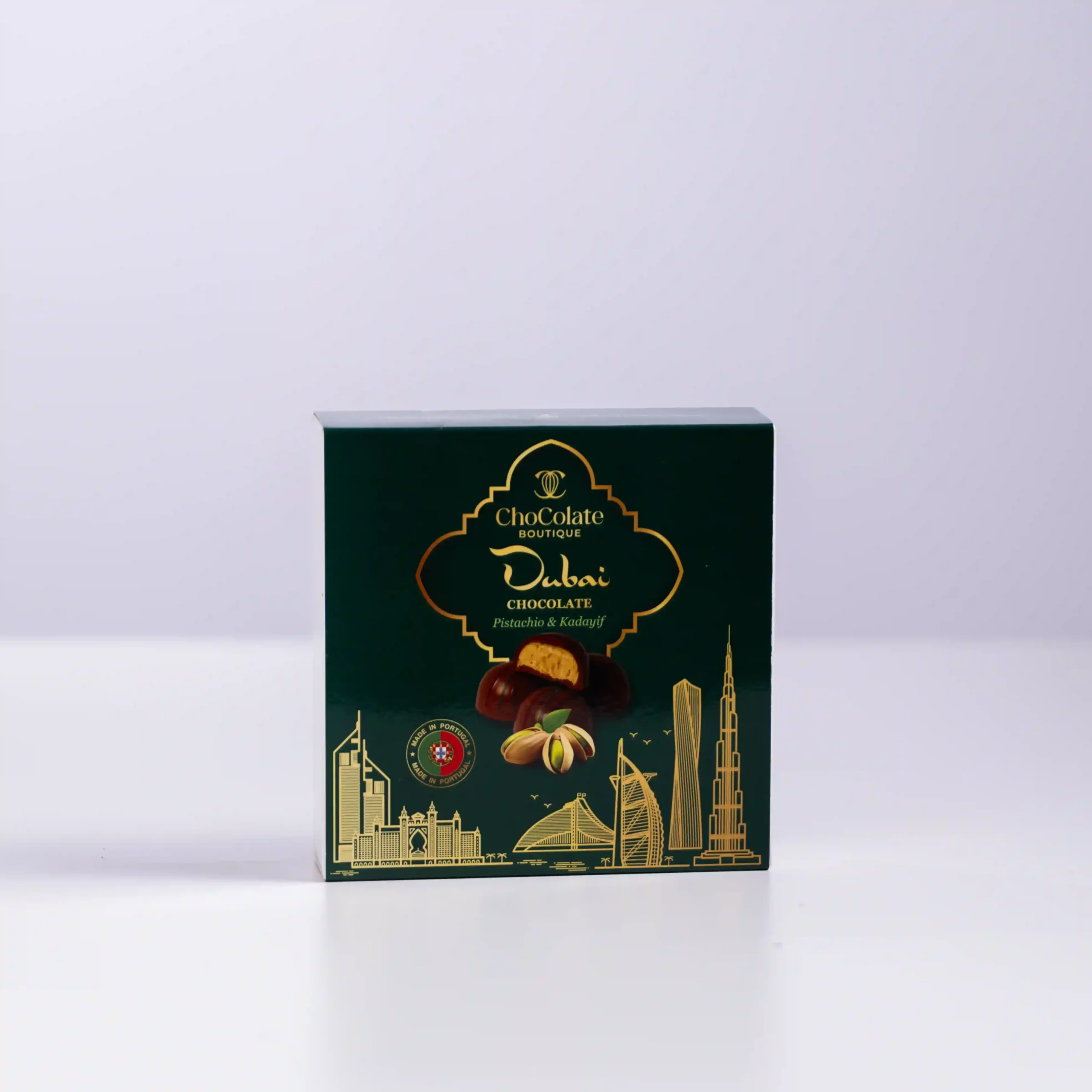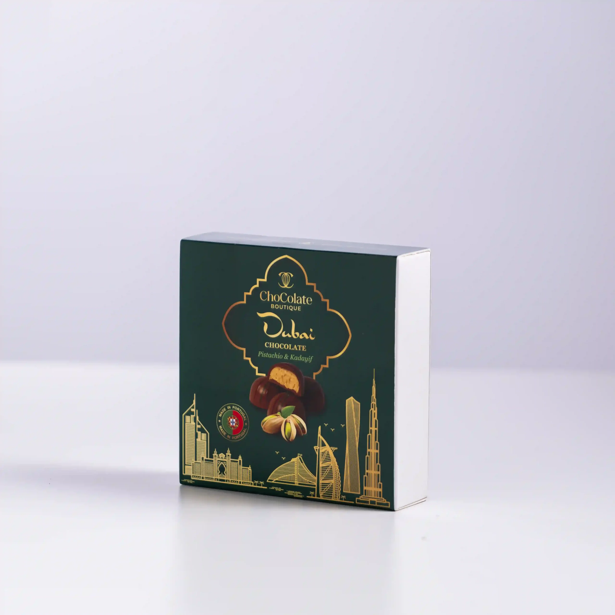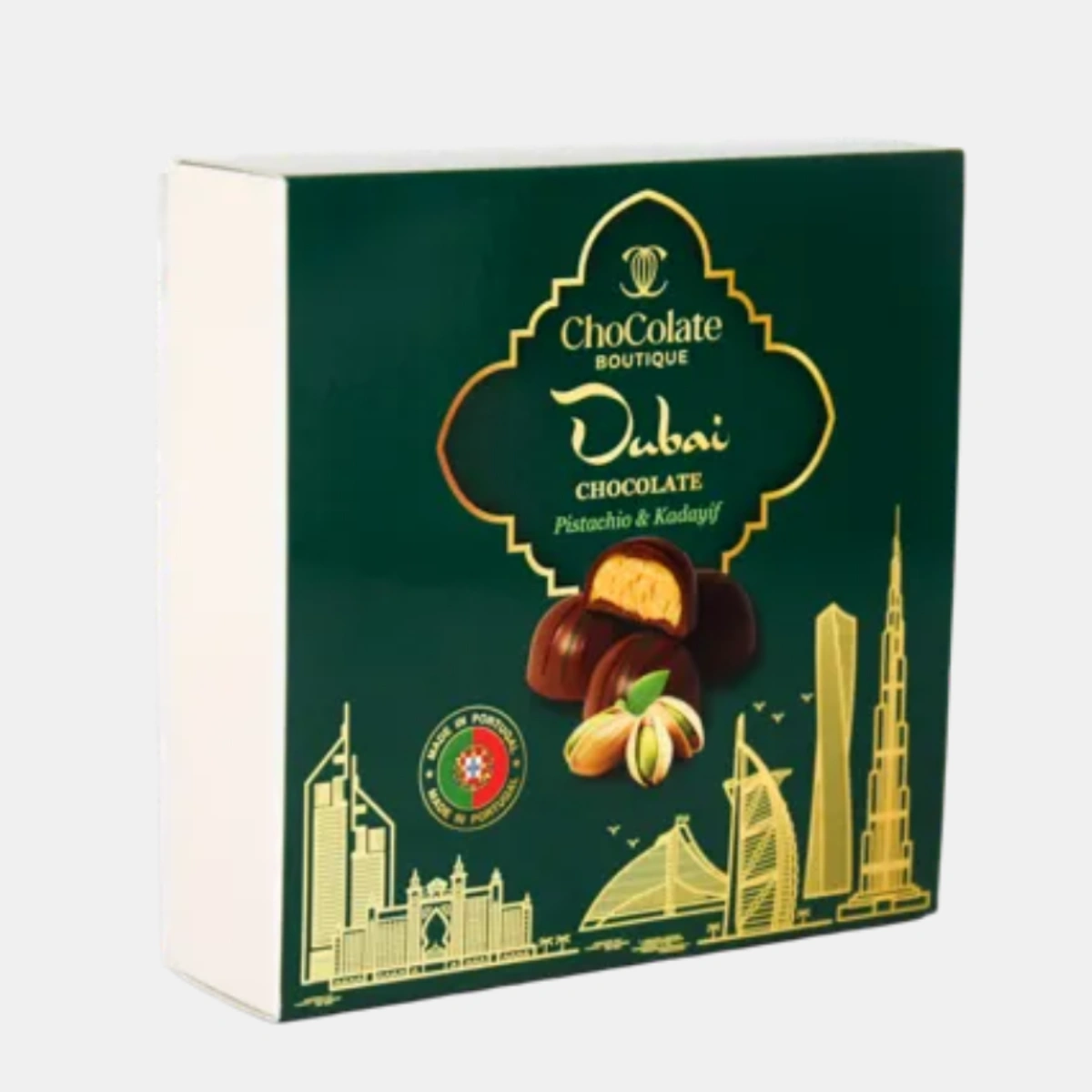 En esta Caja de Bombones Pistachio & Kadayif, Chocolate Boutique descifra el enigma de la textura más codiciada de Dubái y la perfecciona con técnica europea. Bajo una cobertura de chocolate con leche pintada artesanalmente, se esconde el auténtico secreto de esta receta: una crema rica de pistacho entretejida con Kadayif (finos hilos de masa de pastelería tostada y caramelizada). Es una propuesta audaz que rompe la monotonía de los bombones tradicionales, ofreciendo una experiencia acústica y táctil donde la cremosidad portuguesa abraza el crujido exótico del desierto.