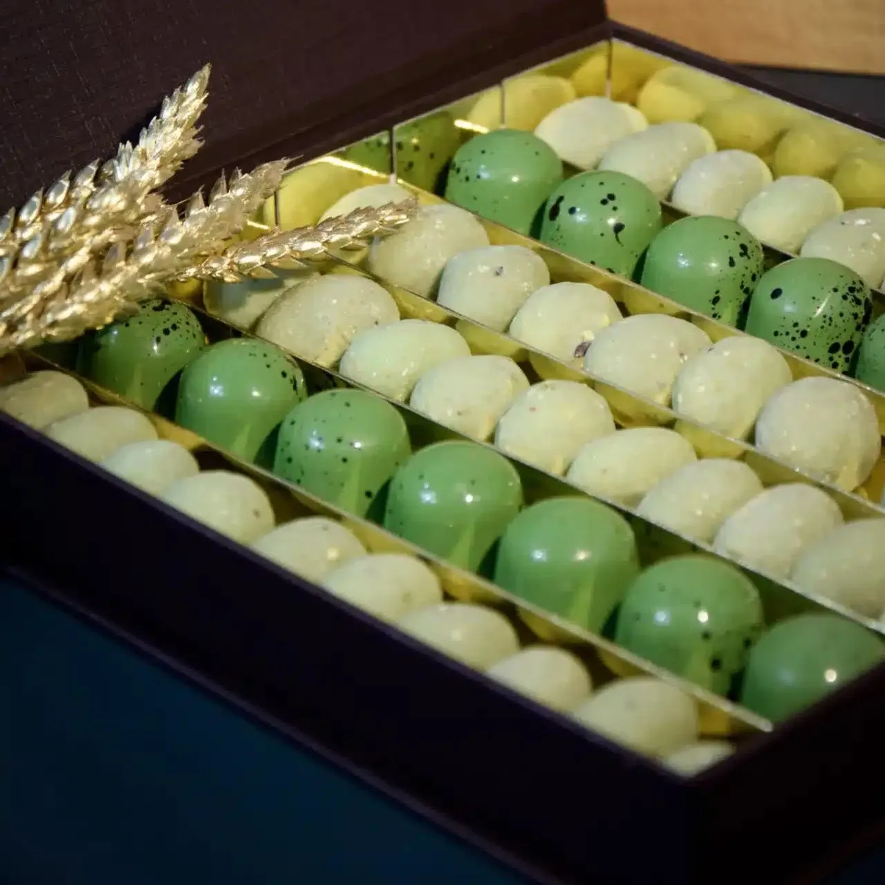 Su aroma es complejo y penetrante, abriendo con notas tostadas de fruto seco de calidad, seguidas de un perfume dulce y herbáceo propio del pistacho natural y matices de vainilla. En boca, la experiencia es un juego de contrastes arquitectónicos: la firmeza crujiente de las almendras recubiertas choca deliciosamente con la textura sedosa y fundente del relleno de los bombones de pistacho. Su sabor es un equilibrio maestro entre el dulzor lácteo del chocolate de cobertura y el carácter sutilmente salado y terroso del pistacho, dejando un retrogusto elegante y persistente.