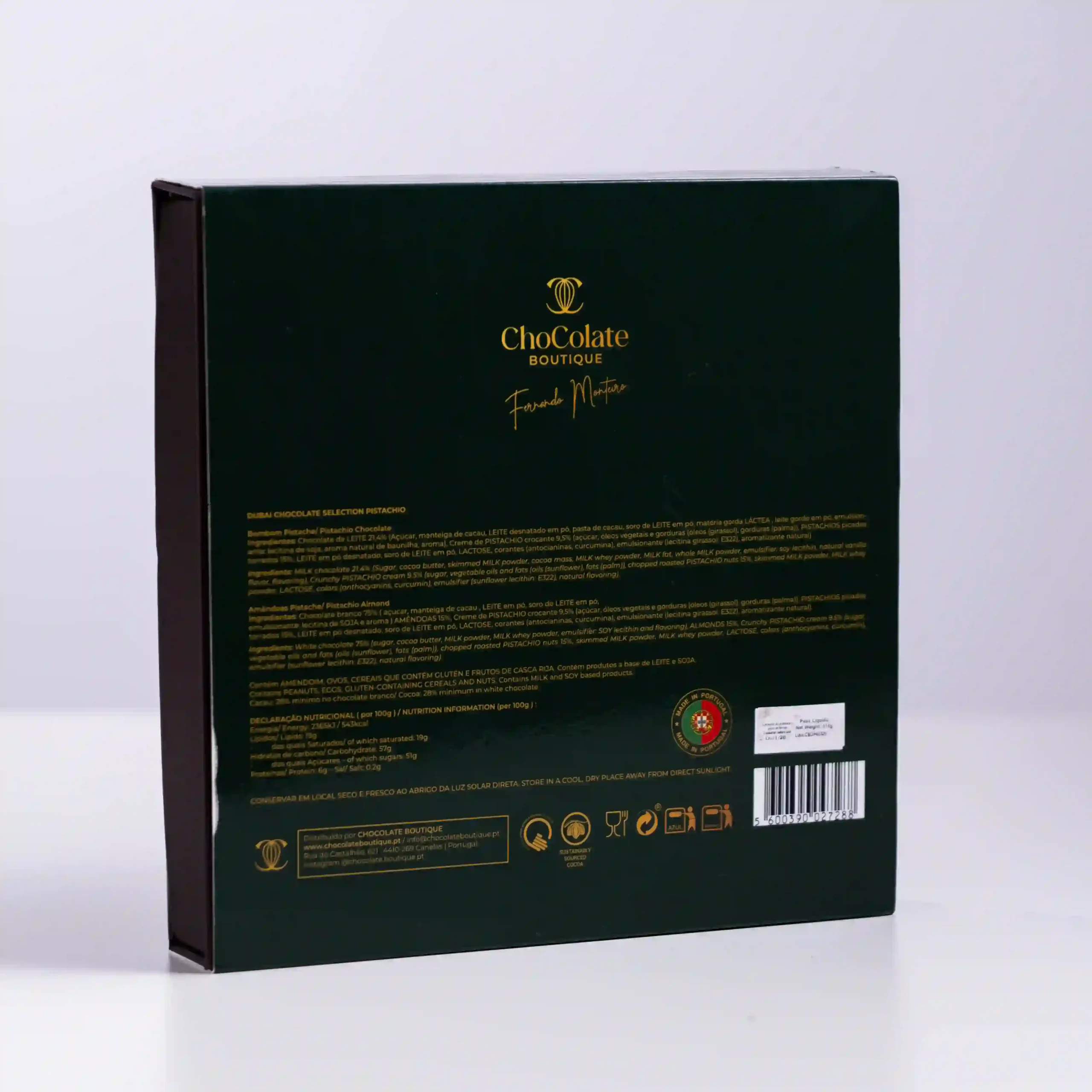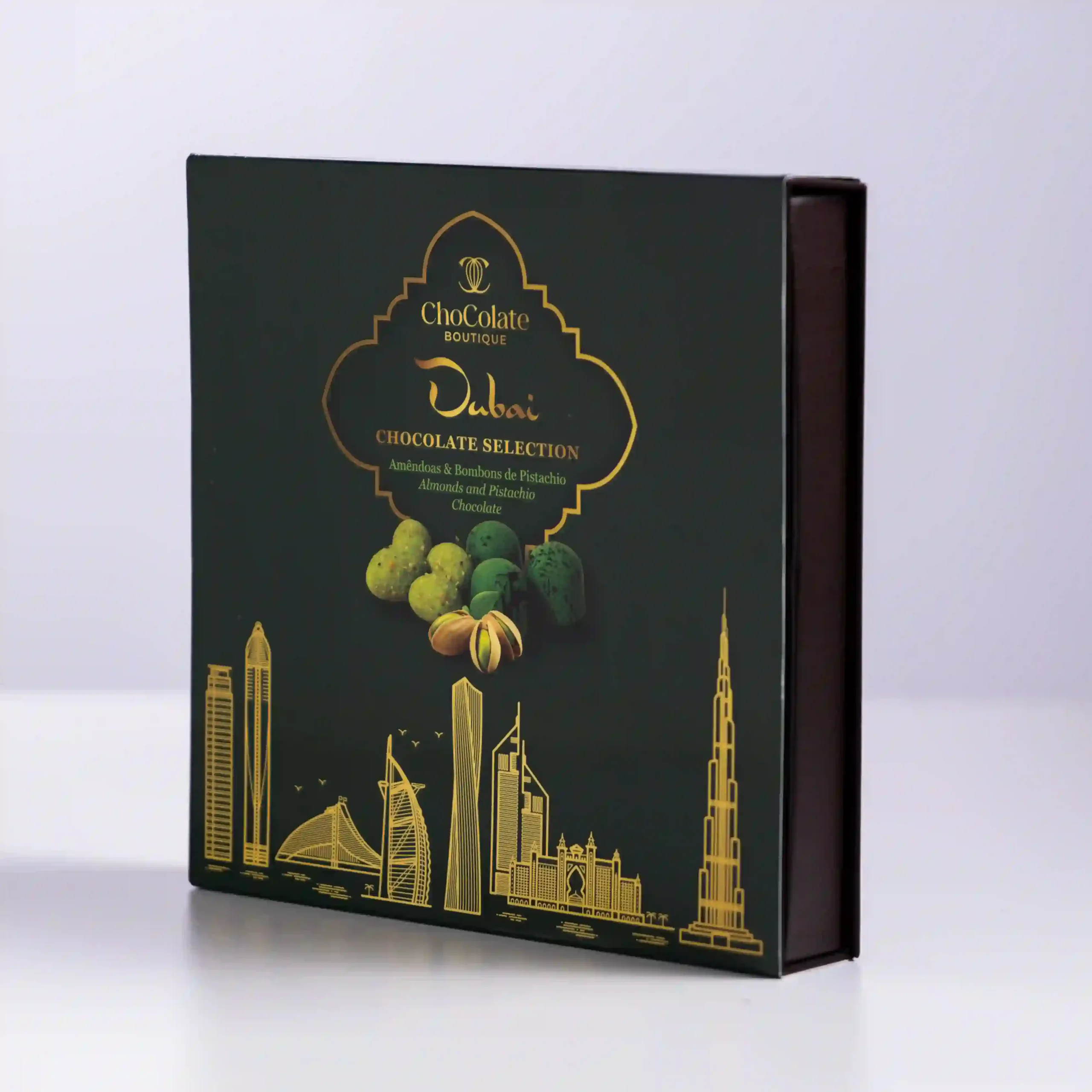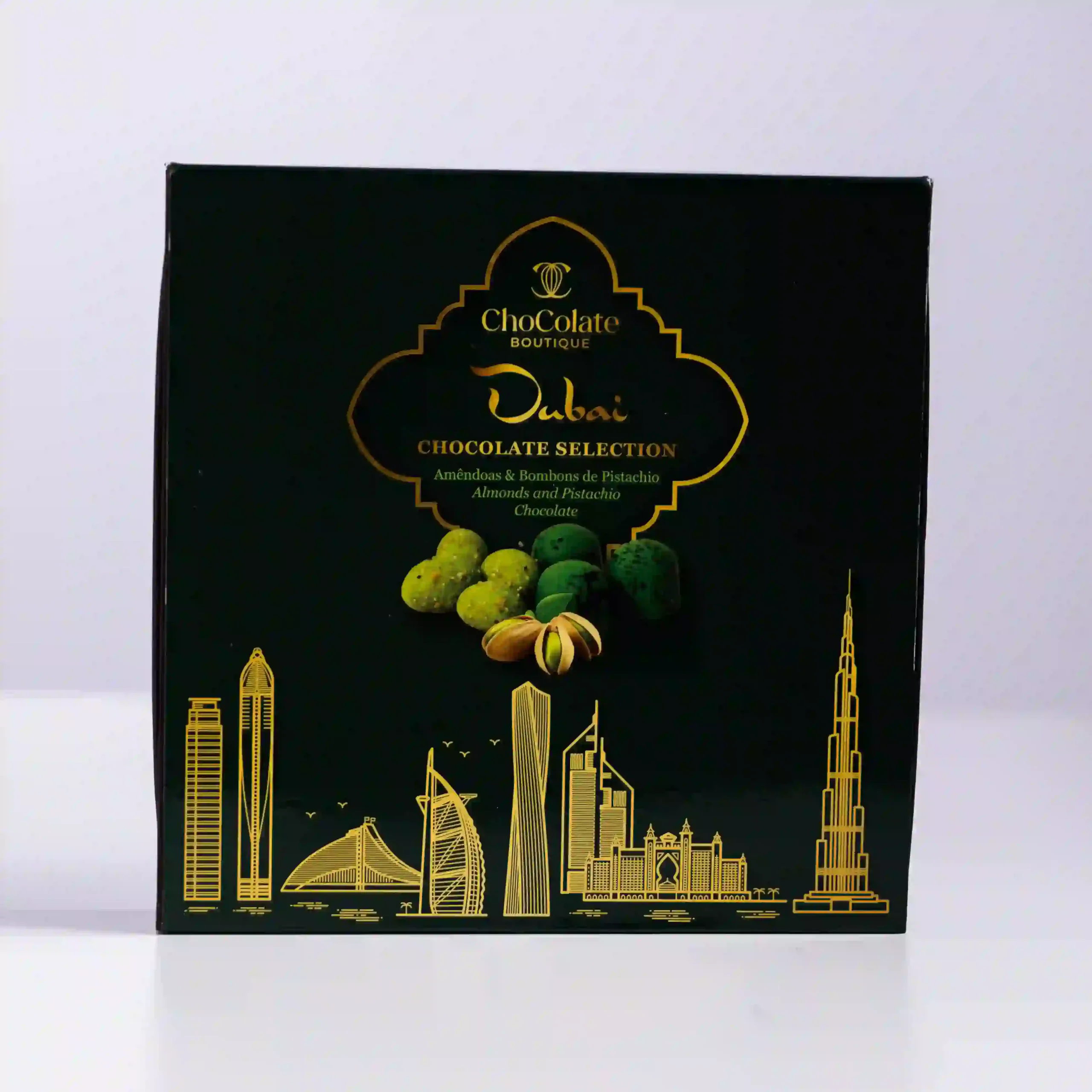 Chocolate Boutique tiende un puente de oro entre la tradición confitera portuguesa y la opulencia moderna de los Emiratos en esta Dubai Chocolate Selection. Inspirada en el lujo de Oriente Medio, esta caja de 510g combina la nobleza de las almendras tostadas con la sofisticación del «oro verde»: el pistacho. Es una selección curada por el chef que transforma el concepto de bombonería en un viaje sensorial, fusionando la crocancia clásica de los frutos secos ibéricos con cremas de pistacho de intensidad gourmet, diseñada para quienes buscan exotismo y elegancia en una misma presentación.