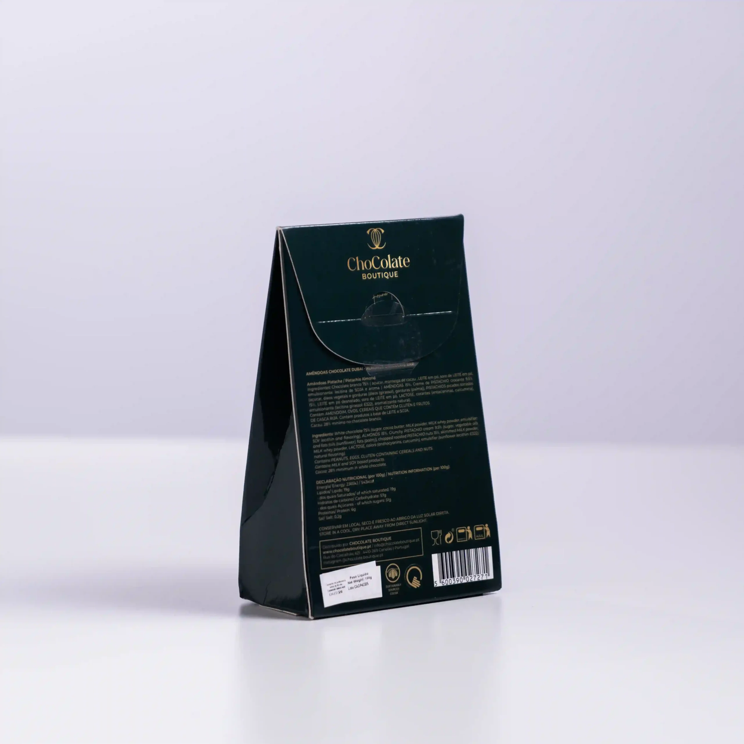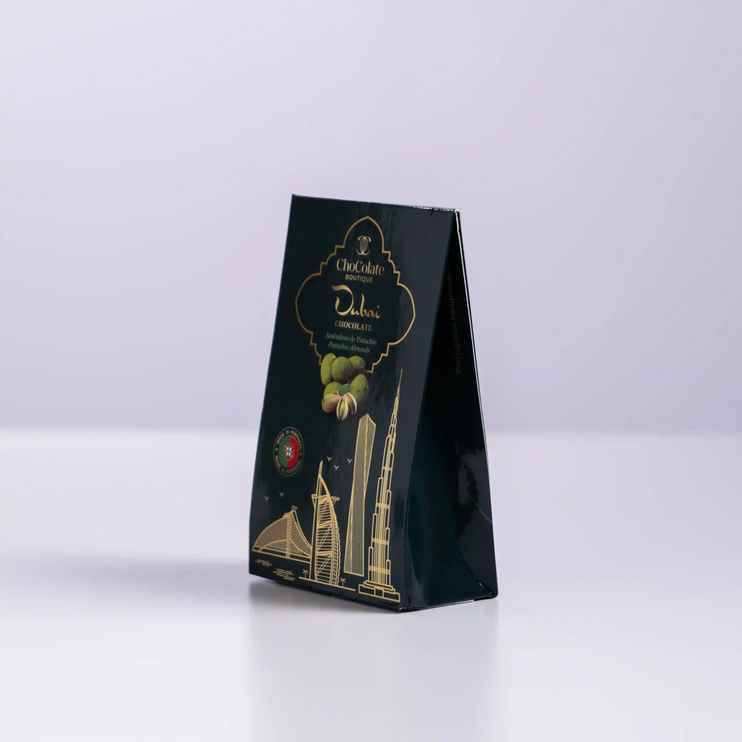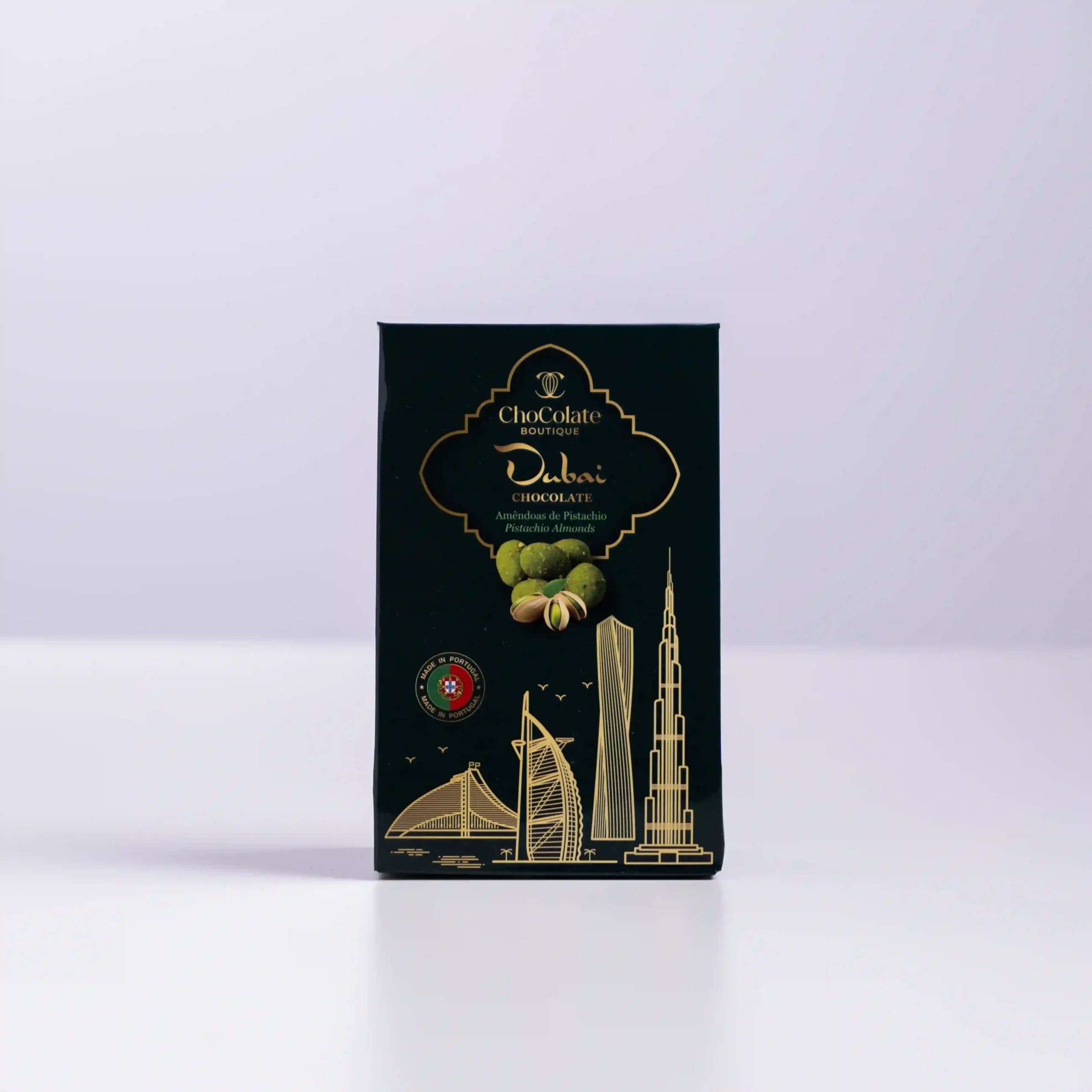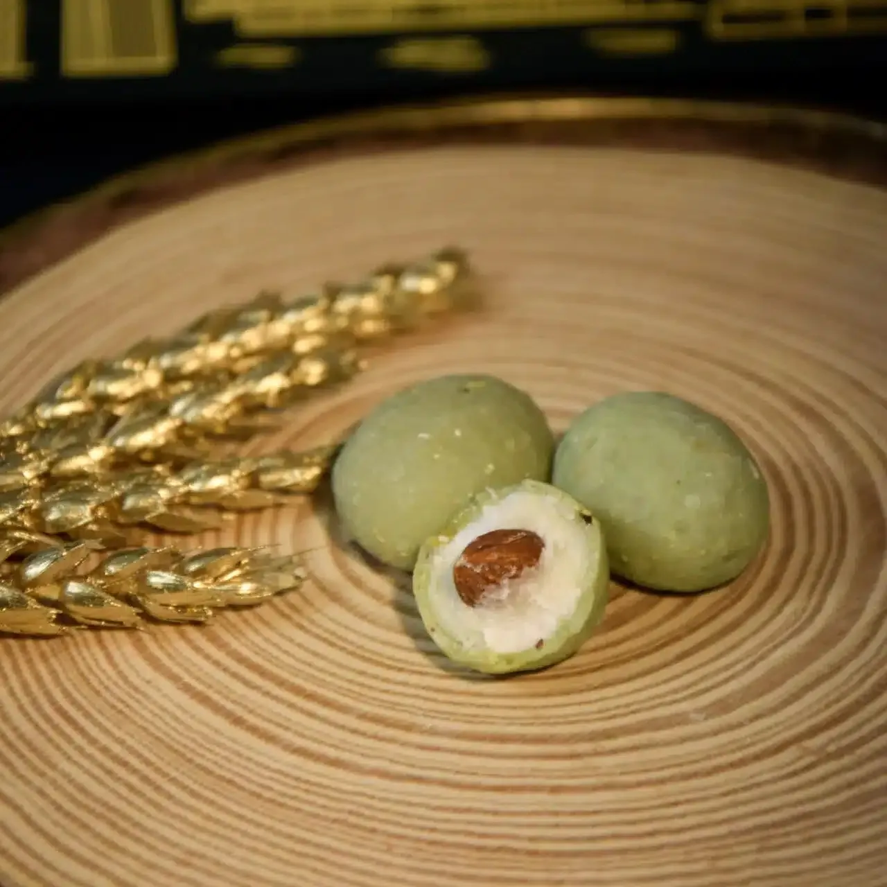 Chocolate Boutique condensa la opulencia de Oriente Medio en un formato listo para llevar con estas Almendras de Pistacho Dubái. Partiendo de la excelencia de la almendra portuguesa —reconocida mundialmente por su calibre y sabor aceitoso—, este drageado gourmet la recubre con una cobertura rica en pistacho, inspirada en los sabores de moda en los Emiratos. Es una receta que reinventa el clásico fruto seco confitado, elevándolo a la categoría de alta repostería, ofreciendo un bocado que equilibra la tradición artesana local con la sofisticación cosmopolita de Dubái.