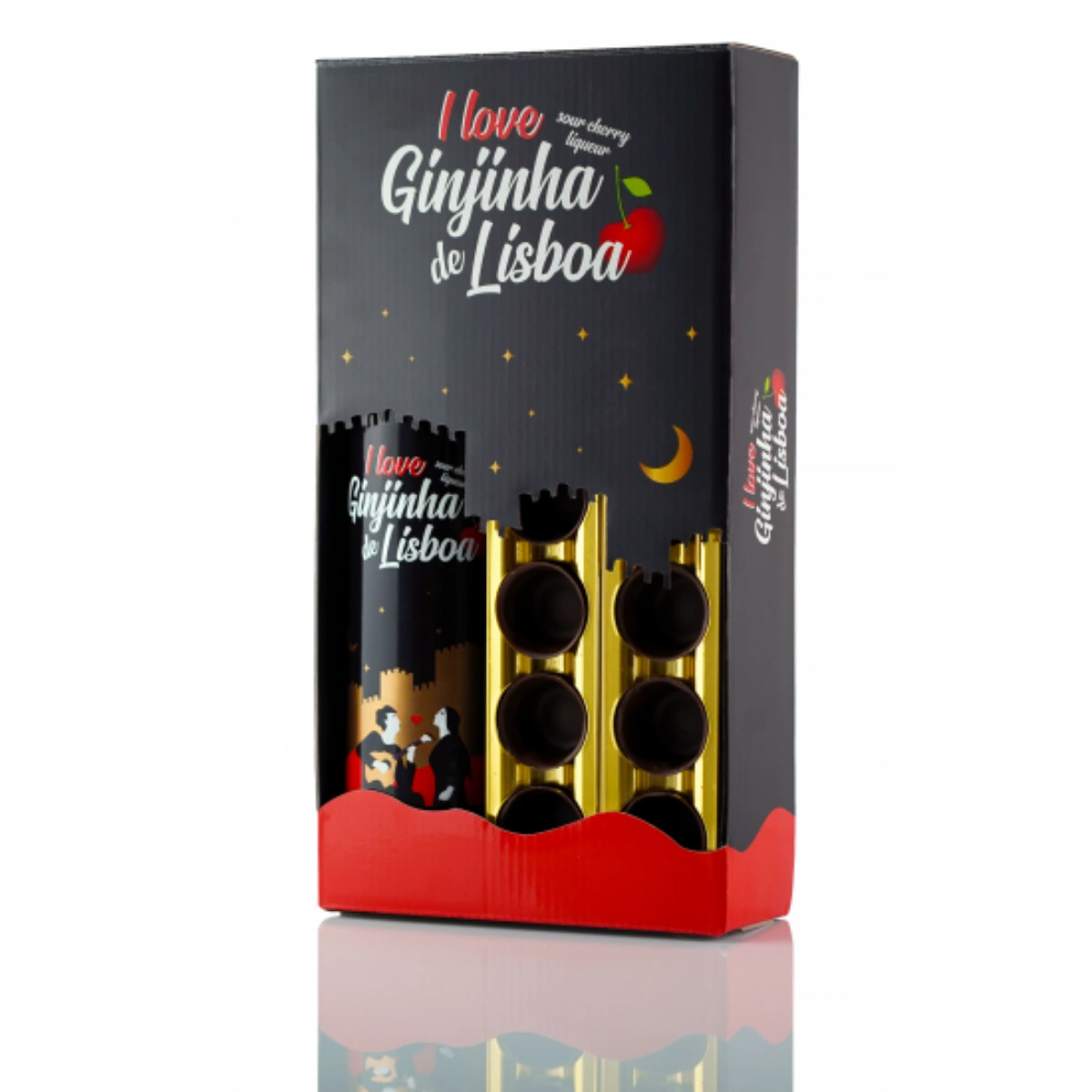 I Love Ginjinha de Lisboa - Botella con 12 Copas de Chocolate.