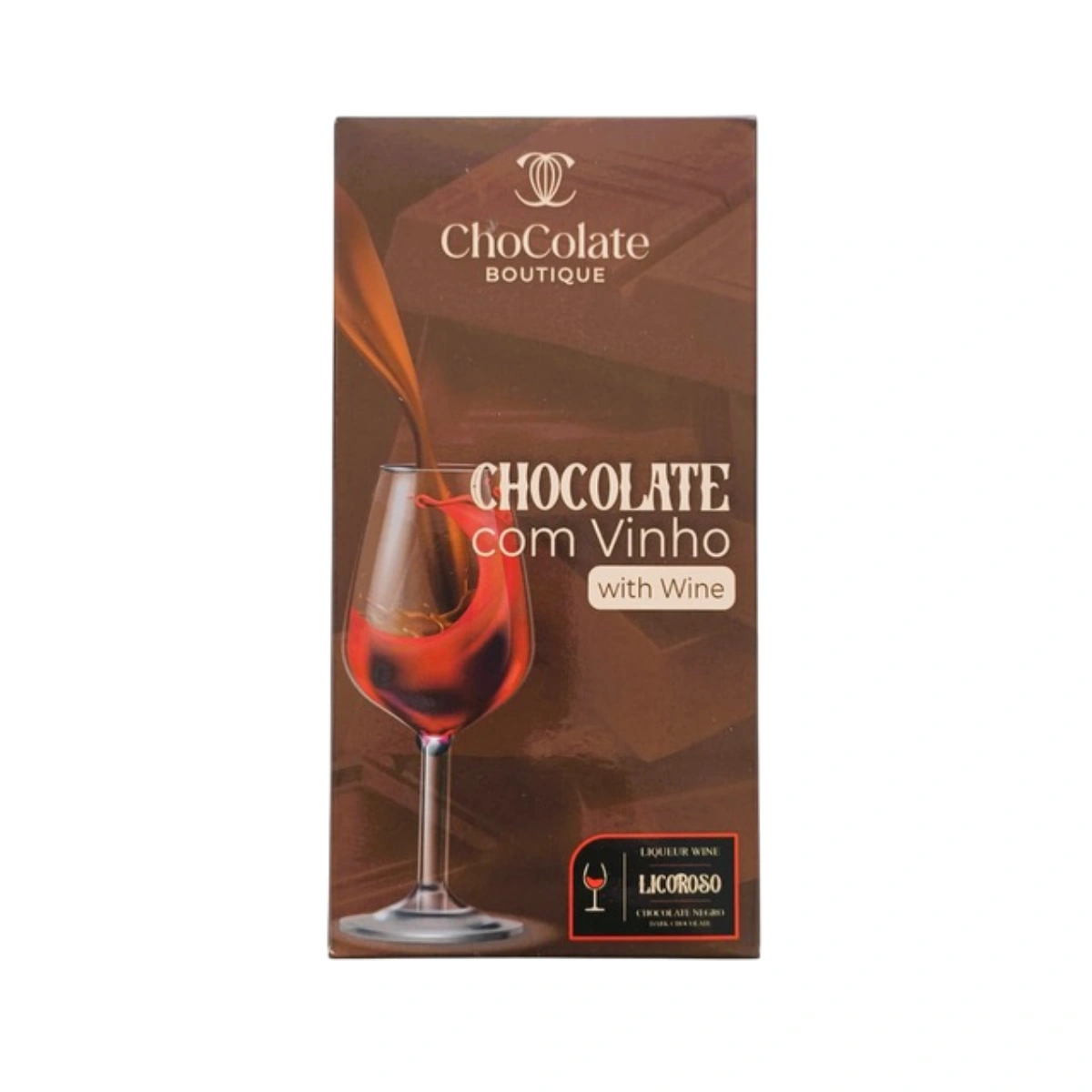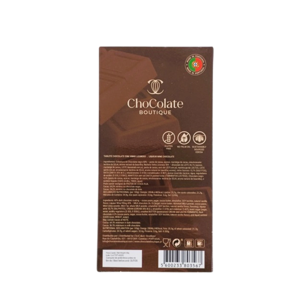 Chocolate Boutique logra el maridaje definitivo en una sola pieza con su tableta Chocolate con Vino Licoroso. Esta creación es un tributo a los dos grandes tesoros de la despensa portuguesa: el cacao y los vinos fortificados. Lejos de ser un chocolate sólido aromatizado, esta tableta esconde un secreto de alta pastelería: bajo una capa crujiente de chocolate negro 60%, reposa una ganache cremosa y embriagadora, enriquecida con auténtico vino licoroso. Es una experiencia adulta y sofisticada, donde la intensidad del cacao y la calidez del alcohol danzan en perfecto equilibrio.
