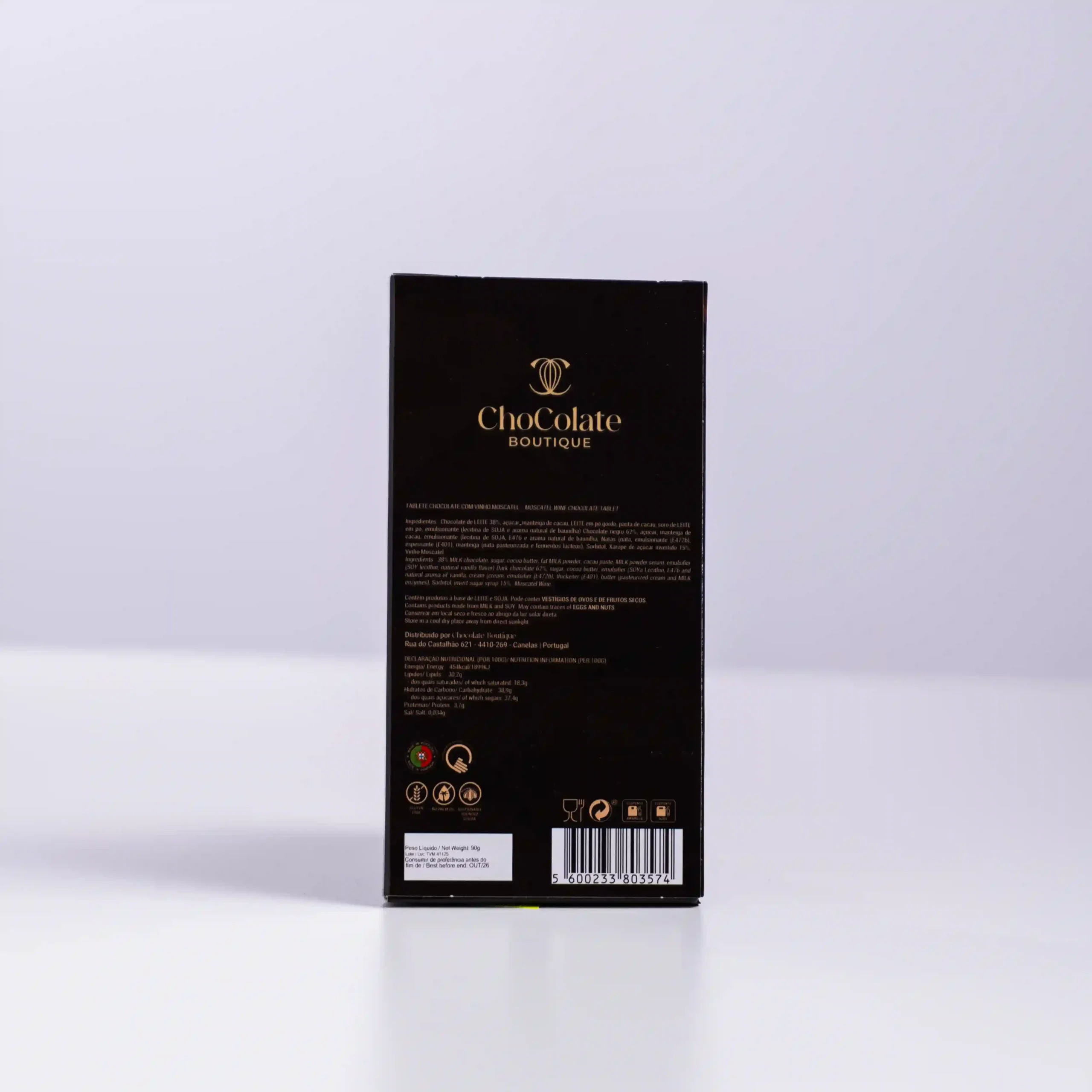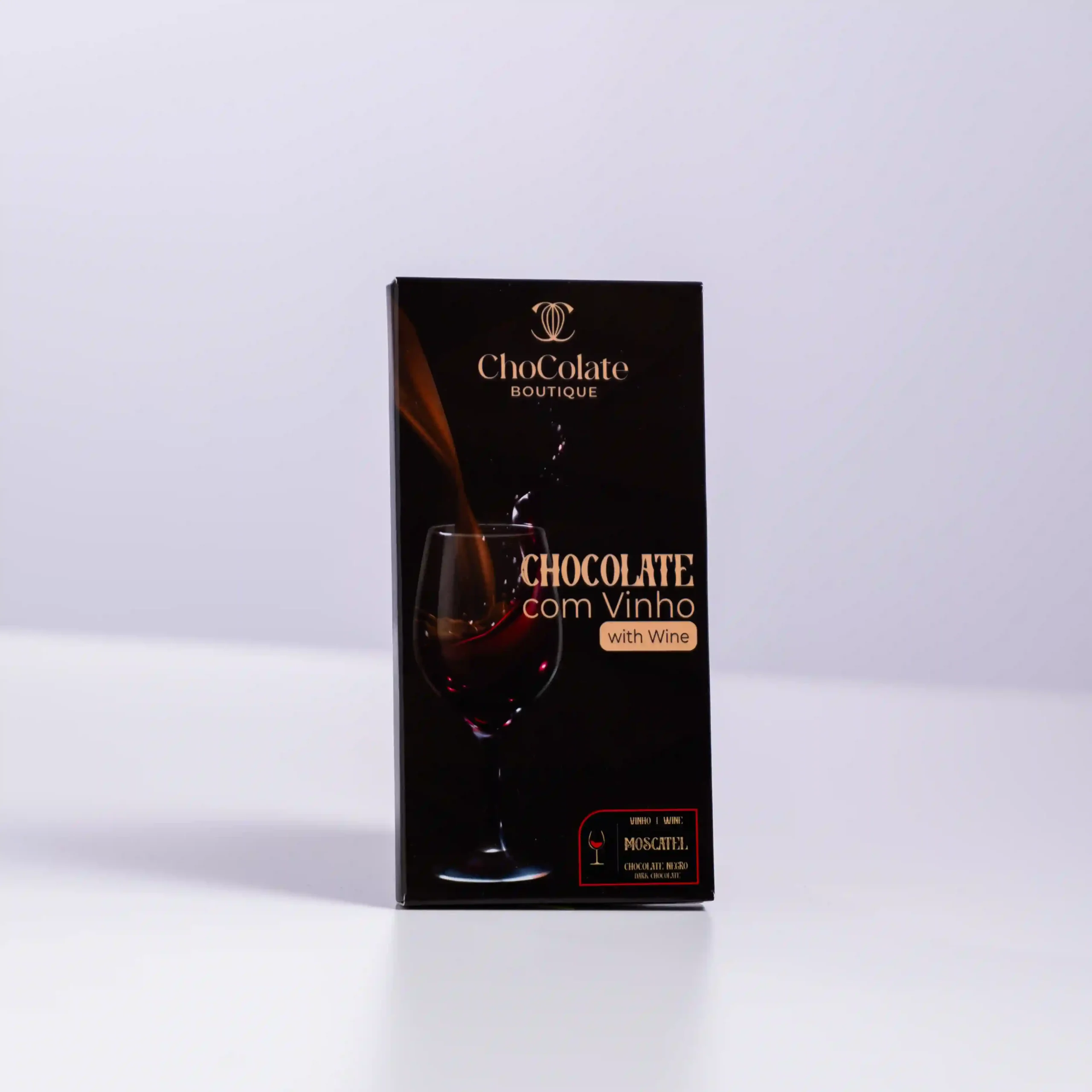 Chocolate Boutique captura la luz dorada de los viñedos portugueses en su tableta Chocolate con Vino Moscatel. Esta creación es la más aromática y seductora de la colección de vinos. En su interior, la robustez de una cobertura de chocolate negro resguarda un corazón tierno y fragante: una ganache enriquecida con auténtico Moscatel. Es un homenaje al «néctar» de Portugal, logrando que las notas florales y amieladas del vino brillen con intensidad sobre el fondo oscuro y elegante del cacao.