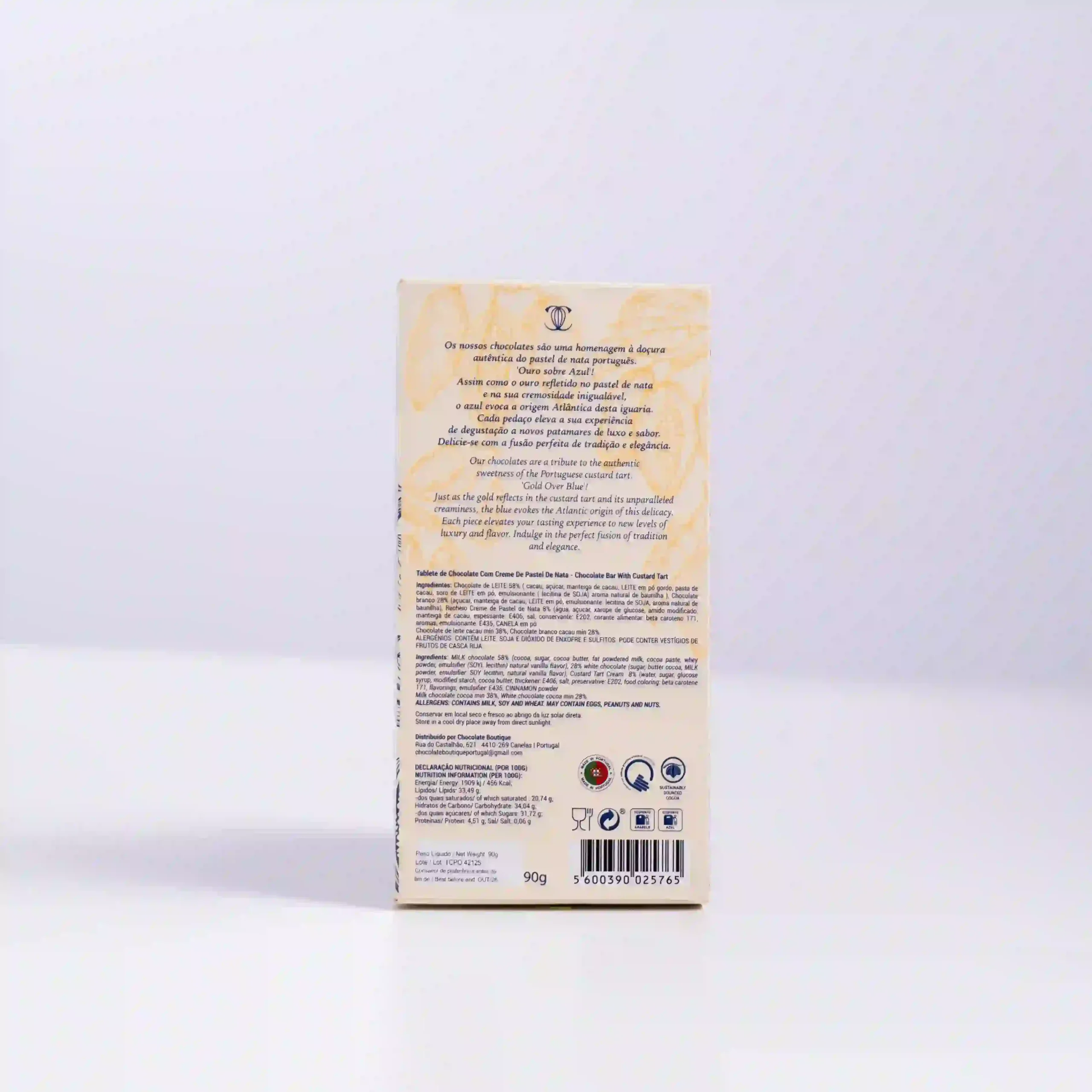 Chocolate Boutique logra lo imposible: encapsular el alma de Lisboa y el sabor más icónico de Portugal en su Tableta de Chocolate Pastel de Nata. Esta creación es un homenaje líquido y sólido a la vez al célebre pastel de crema. Olvida las imitaciones turísticas; aquí se busca la fidelidad aromática. Utilizando una base de chocolate con leche de alta cremosidad, se han infusionado las notas de vainilla, huevo cocido dulce y ese toque imprescindible de canela que define nuestras tardes de café. Es la «saudade» más dulce, lista para llevar a cualquier parte del mundo.