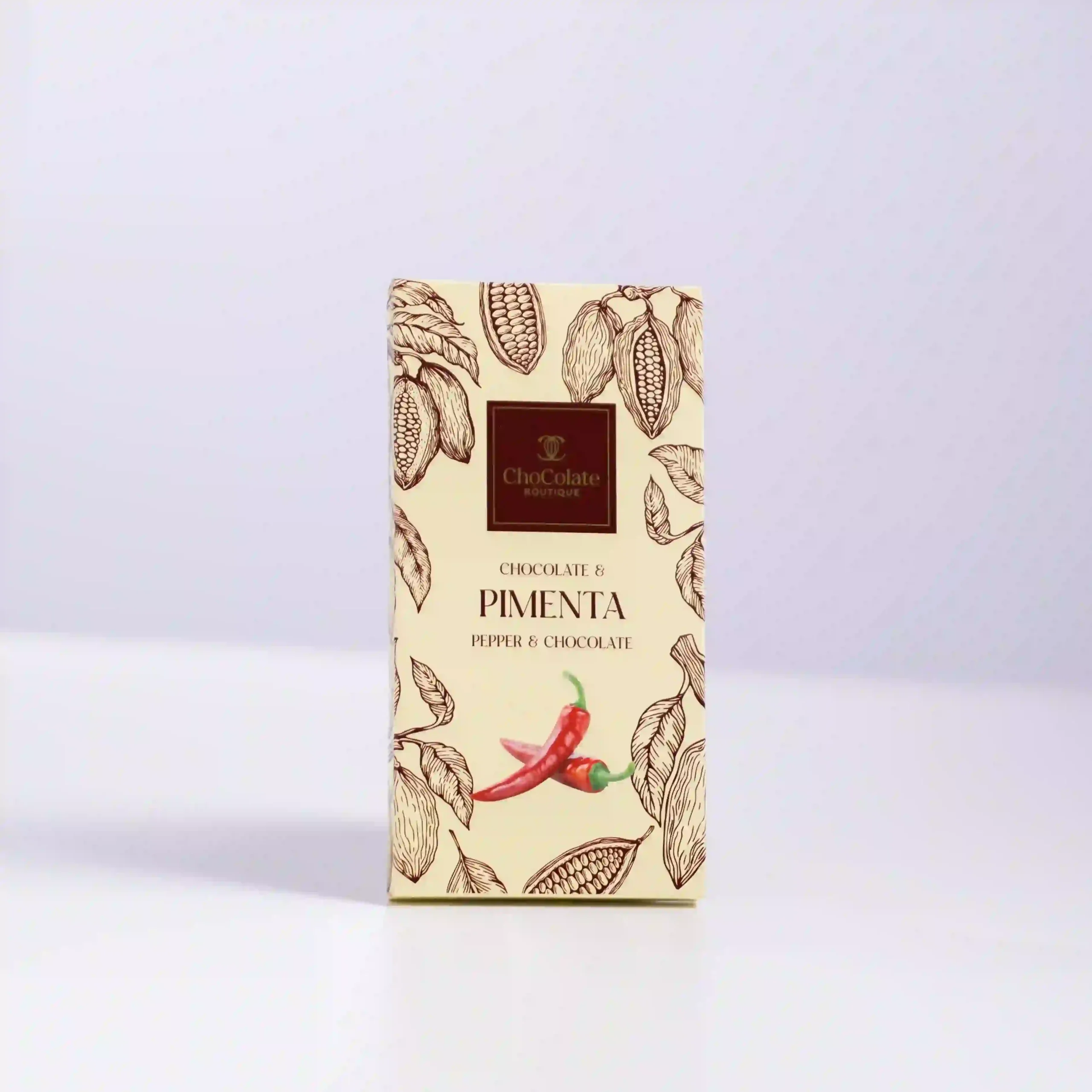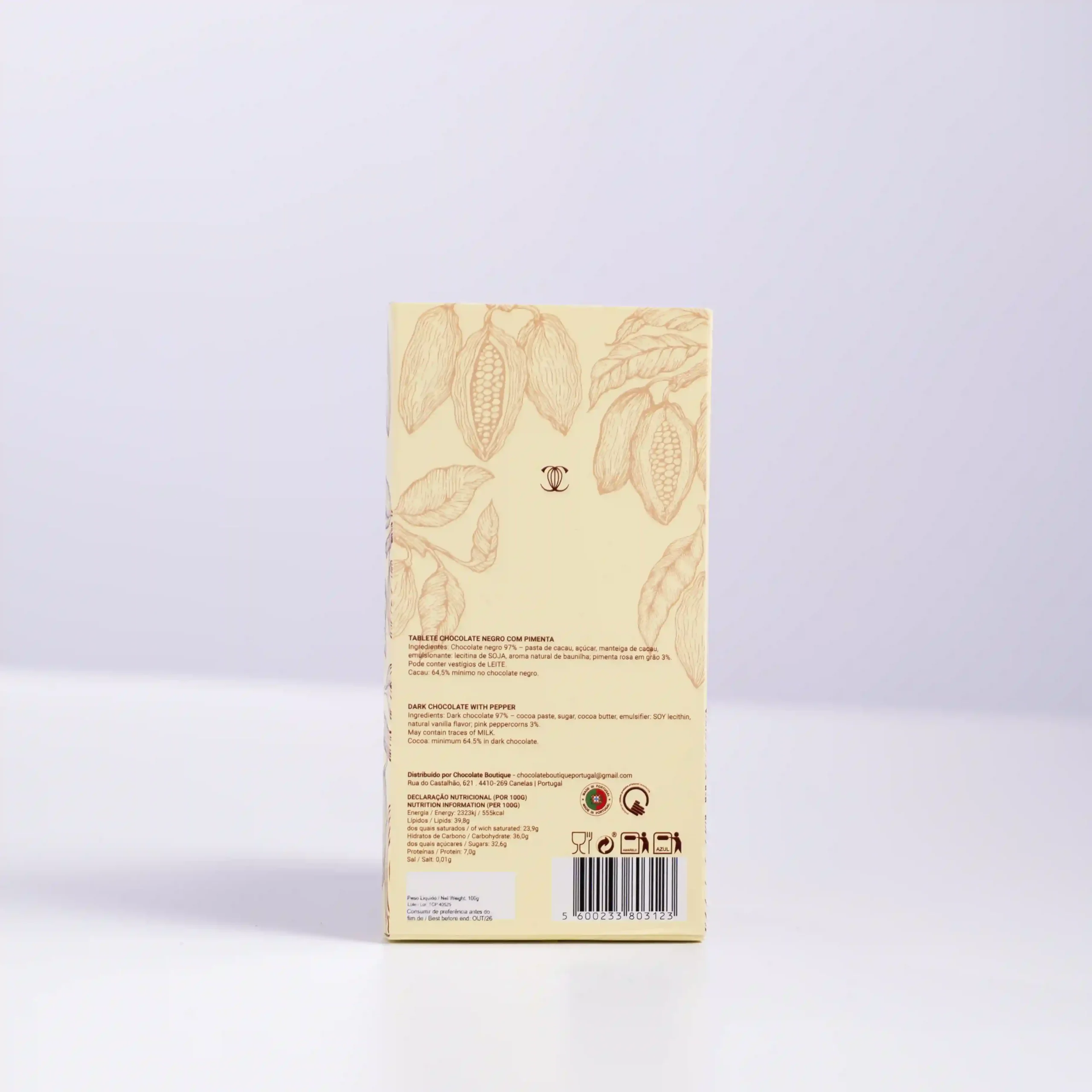 Chocolate Boutique recupera los orígenes ancestrales del cacao con su tableta Chocolate Negro Pimenta de la línea Sabores del Chef. Esta creación es un tributo a la historia de las especias, uniendo la intensidad profunda del chocolate negro con el temperamento ardiente de la pimienta roja (guindilla). Es una experiencia diseñada para el degustador aventurero que busca salir de la monotonía: un chocolate que no solo se saborea, sino que se siente físicamente, aportando una calidez estimulante que recorre el paladar.