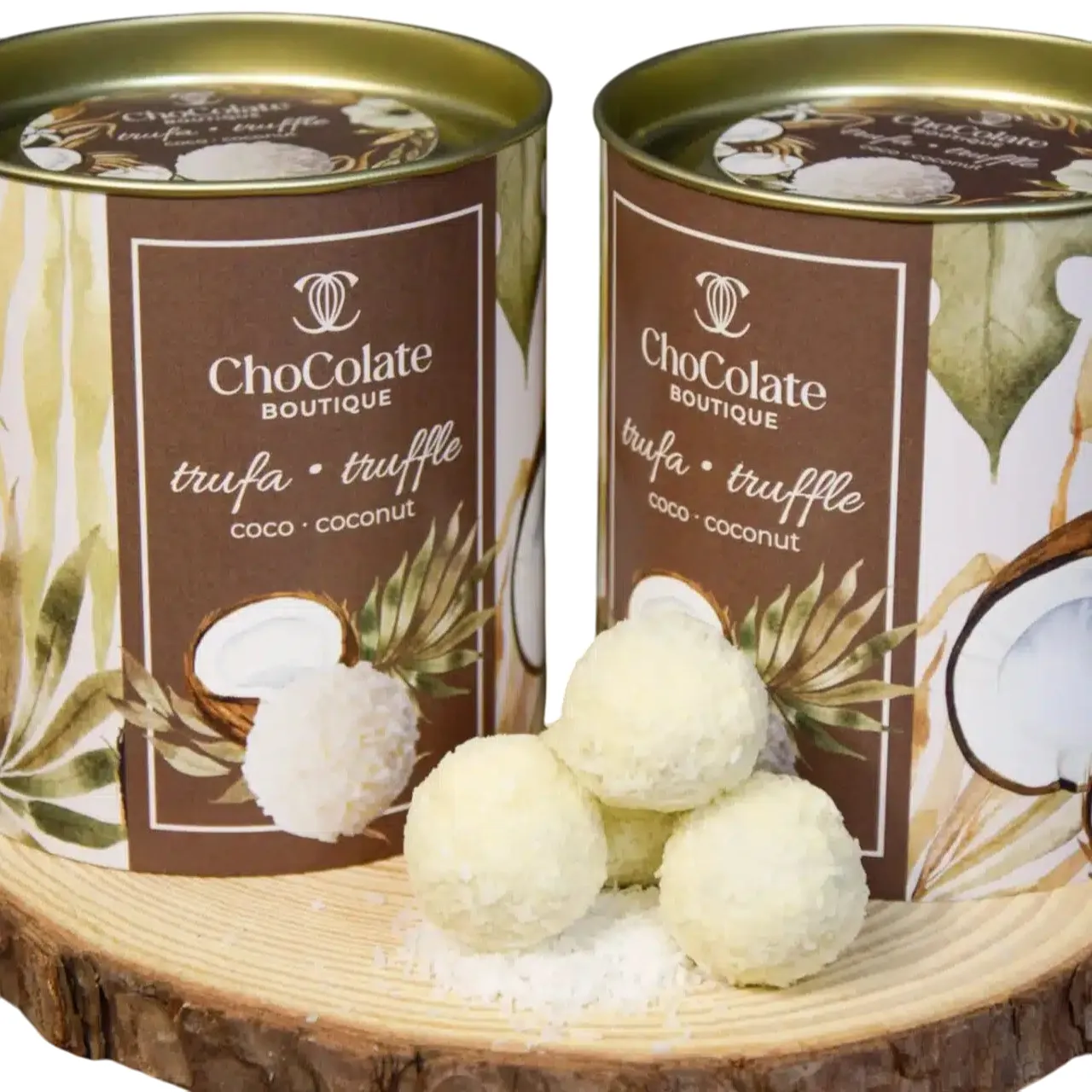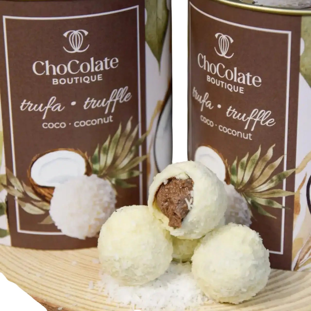 Chocolate Boutique nos transporta a playas de arena blanca y brisa cálida con sus Trufas de Coco. Presentadas en una elegante lata de diseño botánico, estas esferas son la definición de la delicadeza. Lejos de ser un simple dulce, cada trufa es una nube de sabor: un centro de ganache de chocolate blanco extremadamente cremoso, envuelto en una generosa capa de coco rallado seleccionado por su frescura y aroma. Es el bocado ideal para quienes prefieren la suavidad láctea y los aromas exóticos sobre la intensidad del cacao oscuro.
